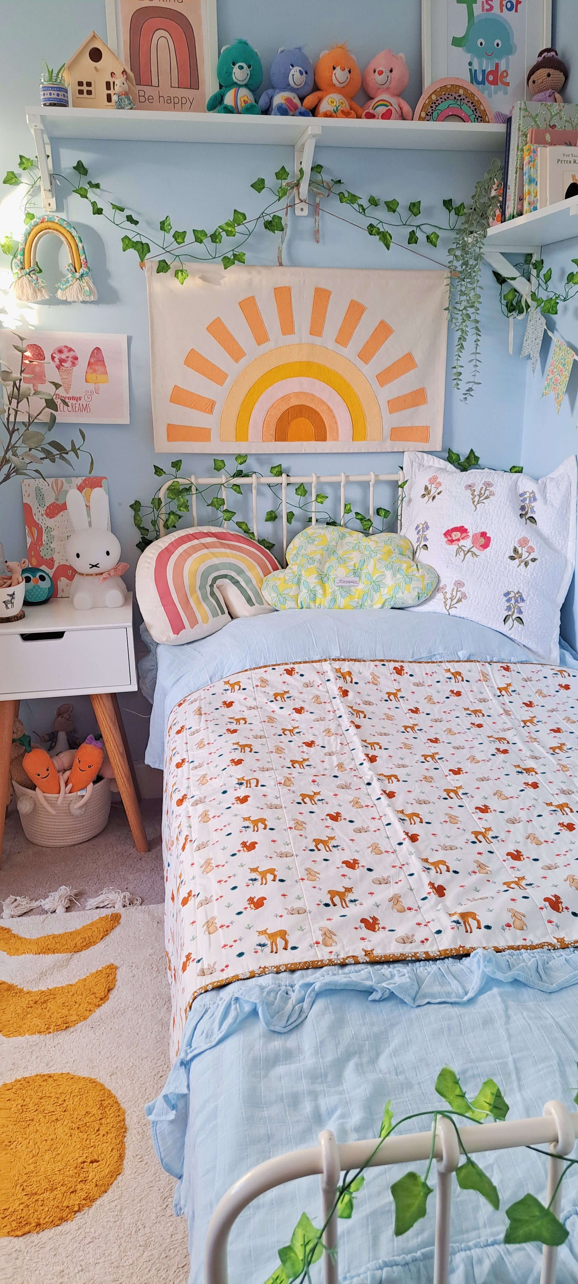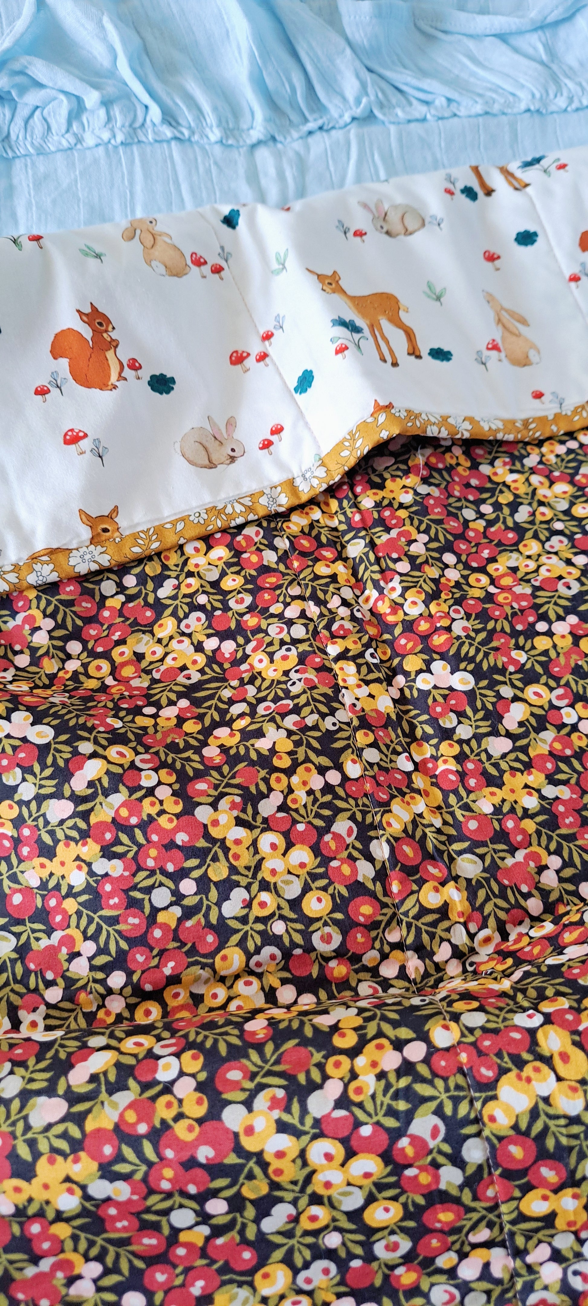 This gorgeous woodland creatures Belle and Boo fabric has a magical feel to it and contrasts perfectly with the luxurious, silky tana lawn Wiltshire berry fabric and mustard Capel hand sewn binding. This unique quilt will be a timeless classic and bring joy to many generations.