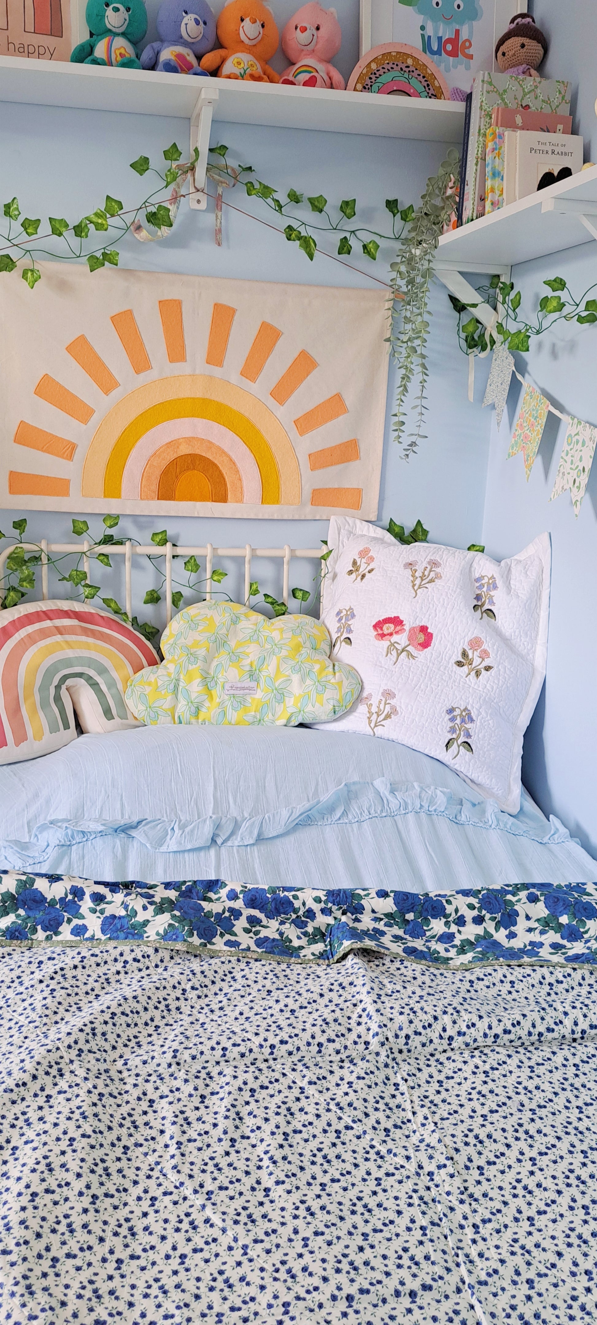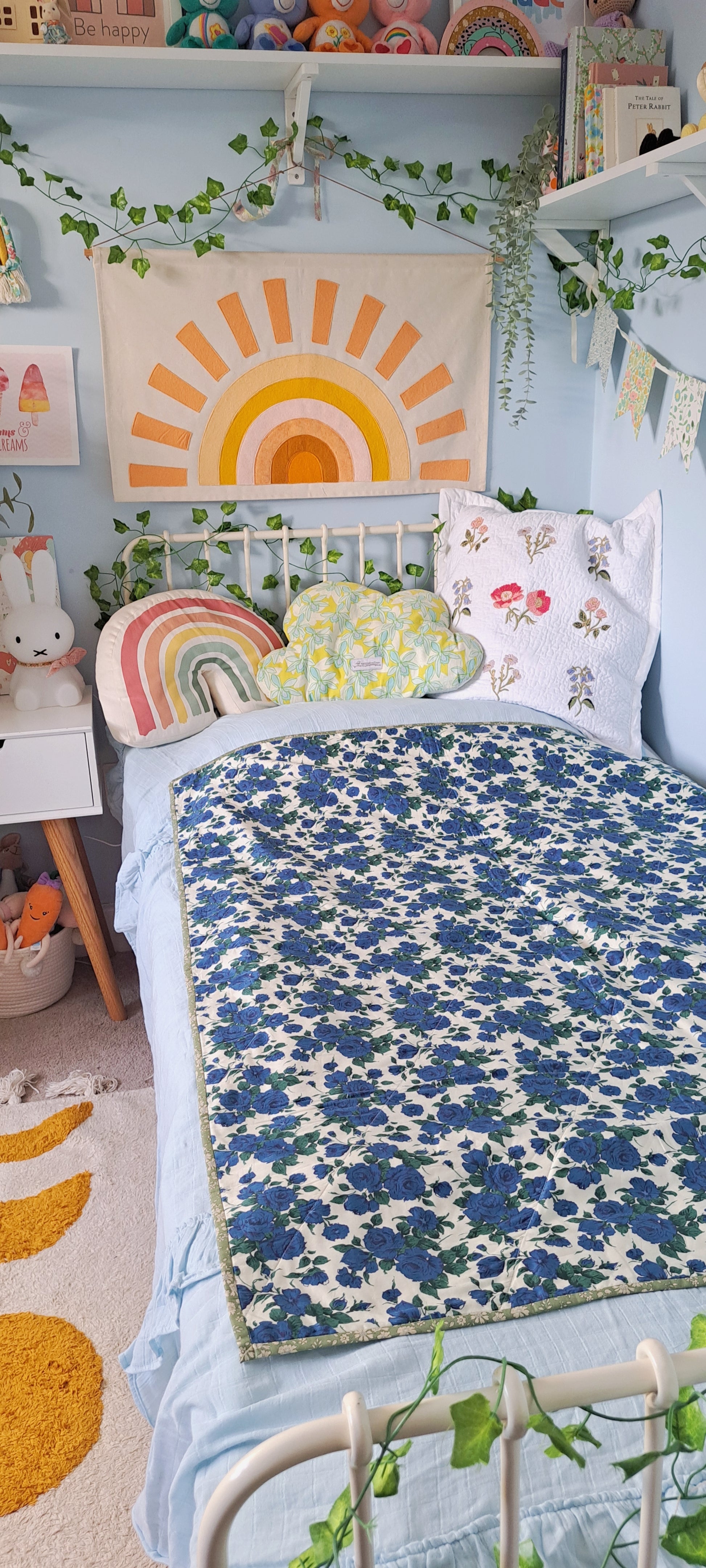 Liberty do blue fabrics so well (take a peek at the Kirstykins Blue Rainbow quilt to see for yourself) The two fabrics in this quilt are divine, a large and small rose pattern for each side, so soft and silky to the touch. All this gorgeousness is framed in the signature Kirstykins handmade and hand stitched binding for that final flourish of luxury in the timeless classic green Capel.