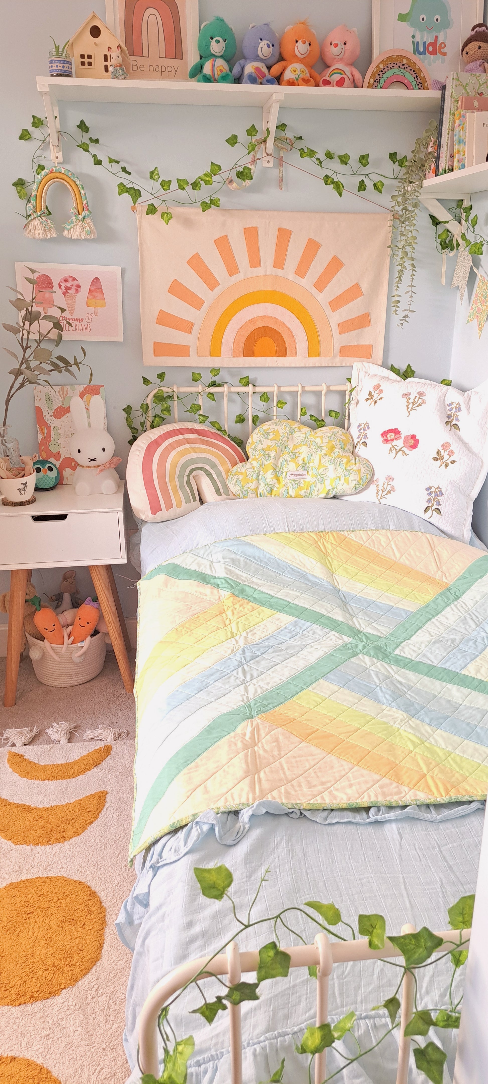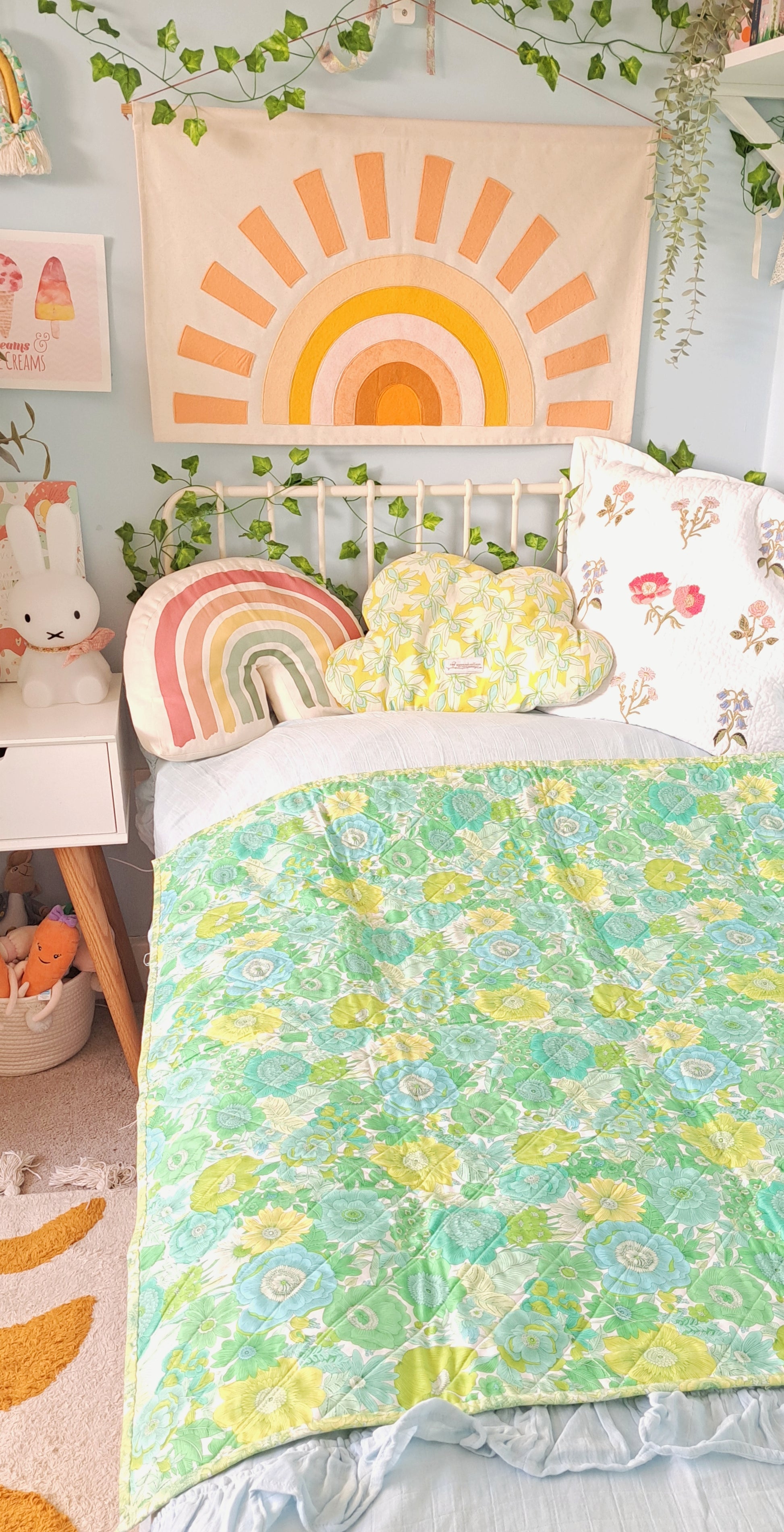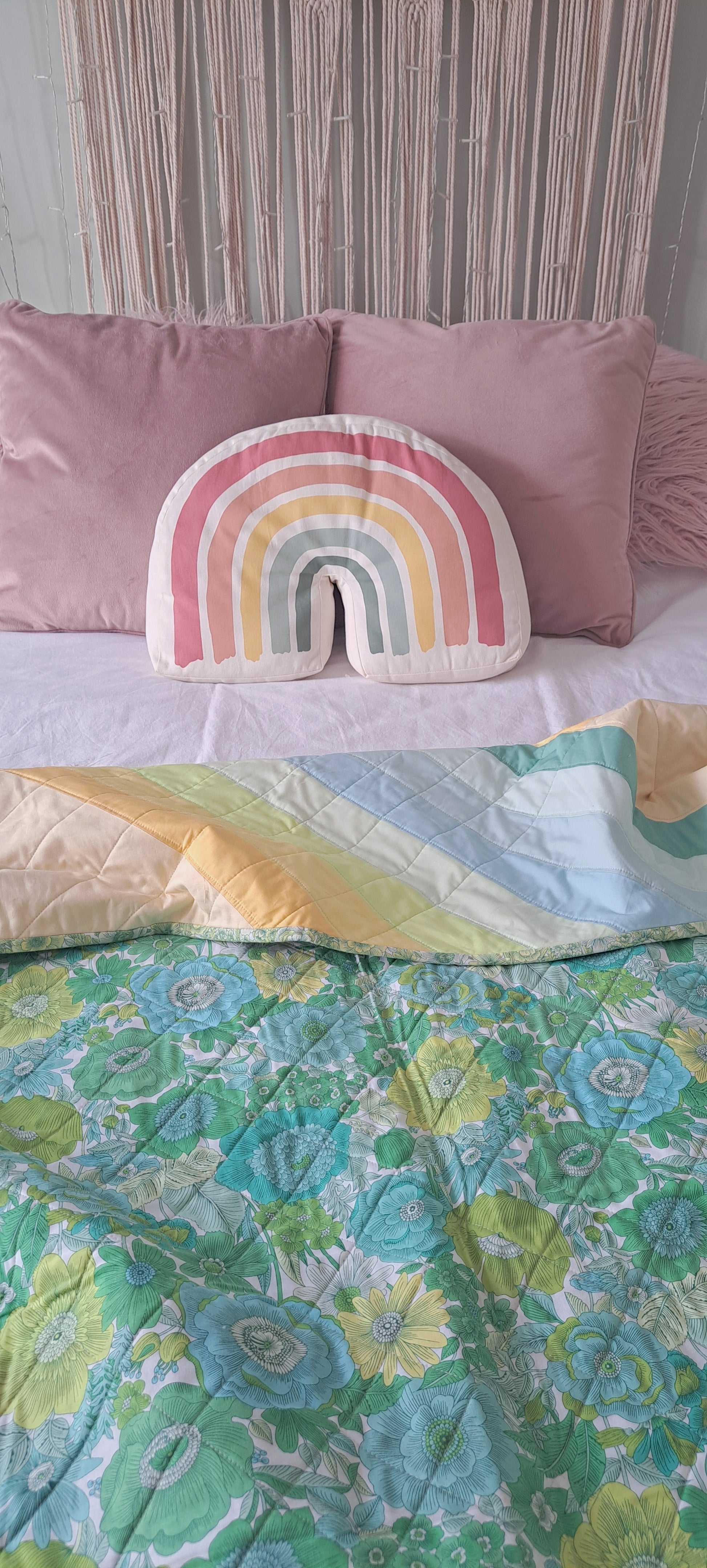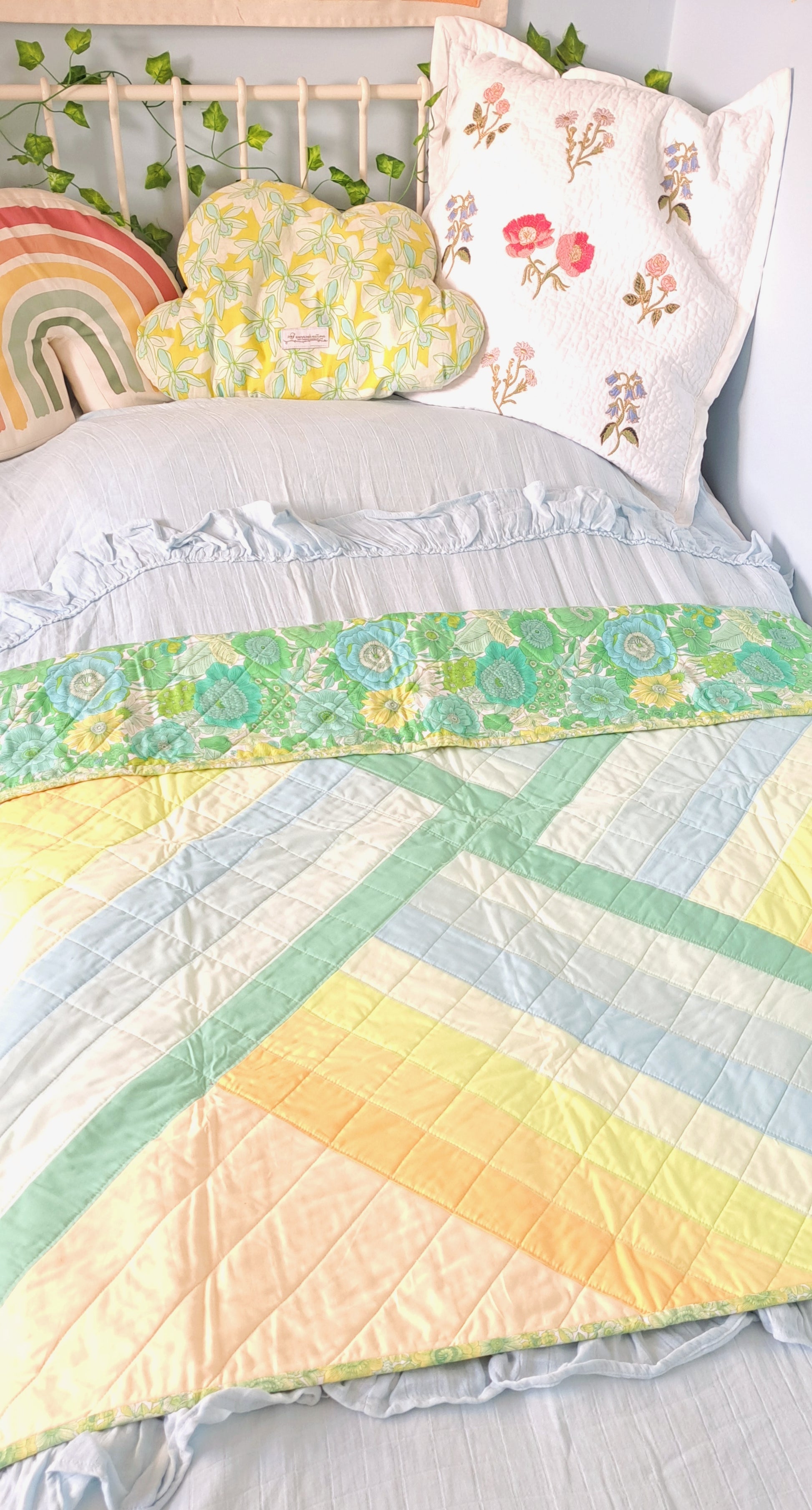 This patchwork quilt is a fabulous version of the Suzy Quilts Adventure Land pattern. Carefully selected Art Gallery solid fabrics are sewn together to create a beautiful spectrum of green and yeĺlow tones. The back is a stunning green 70's style floral, the handsewn binding is a different green floral.