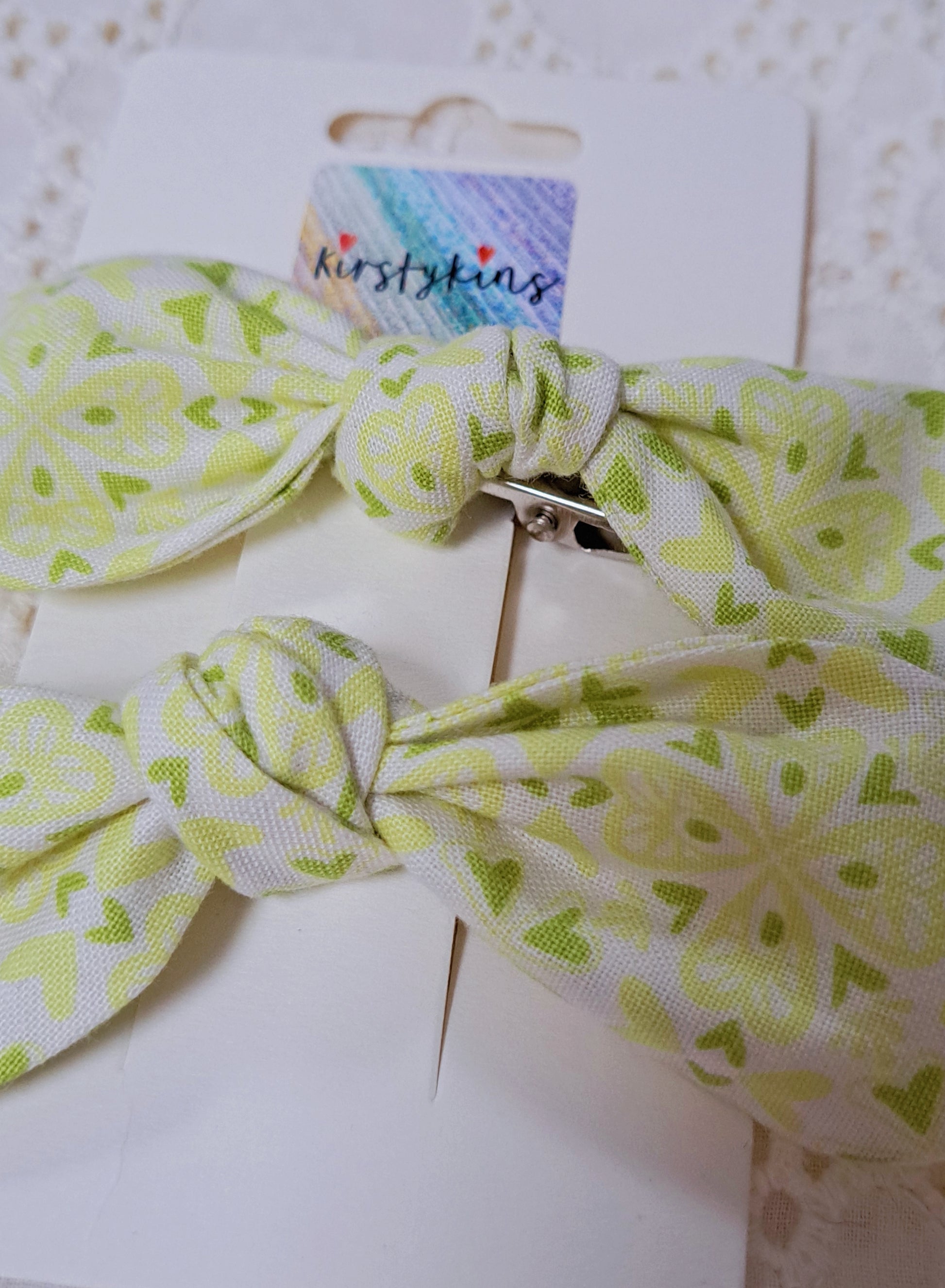 Handmade fabric bow tied onto a small silver crocodile clip.